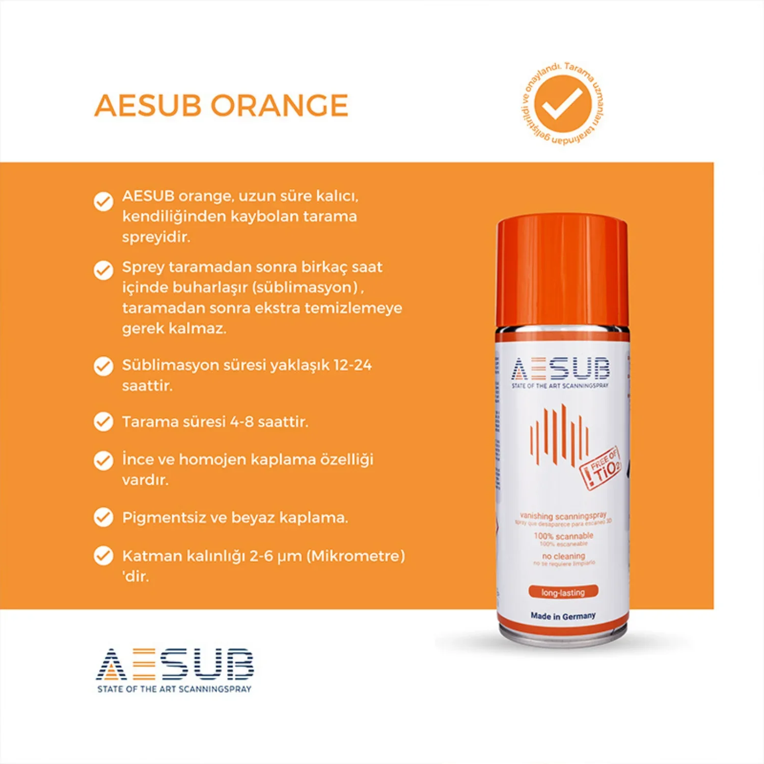 AESUB Turuncu Tarama Spreyi, tarama uzmanları tarafından geliştirilen yenilikçi bir tarama spreyidir. Bu sprey, nesnenin yüzeyine homojen ve ince bir mat tabaka uygular, bu da optik tarama uygulamalarında optimum kontrast değerleri elde etmenizi sağlar. AESUB Turuncu Tarama Spreyi, malzeme uyumluluğu açısından optimize edilmiştir ve pigmentler, itici gaz ve solvent içerir. Avrupa Kimyasallar Ajansı tarafından solunması yoluyla kanserojen olaylarla ilişkilendirilen titanyum dioksit içermez, bu da onu daha güvenli bir kullanım için ideal kılar.