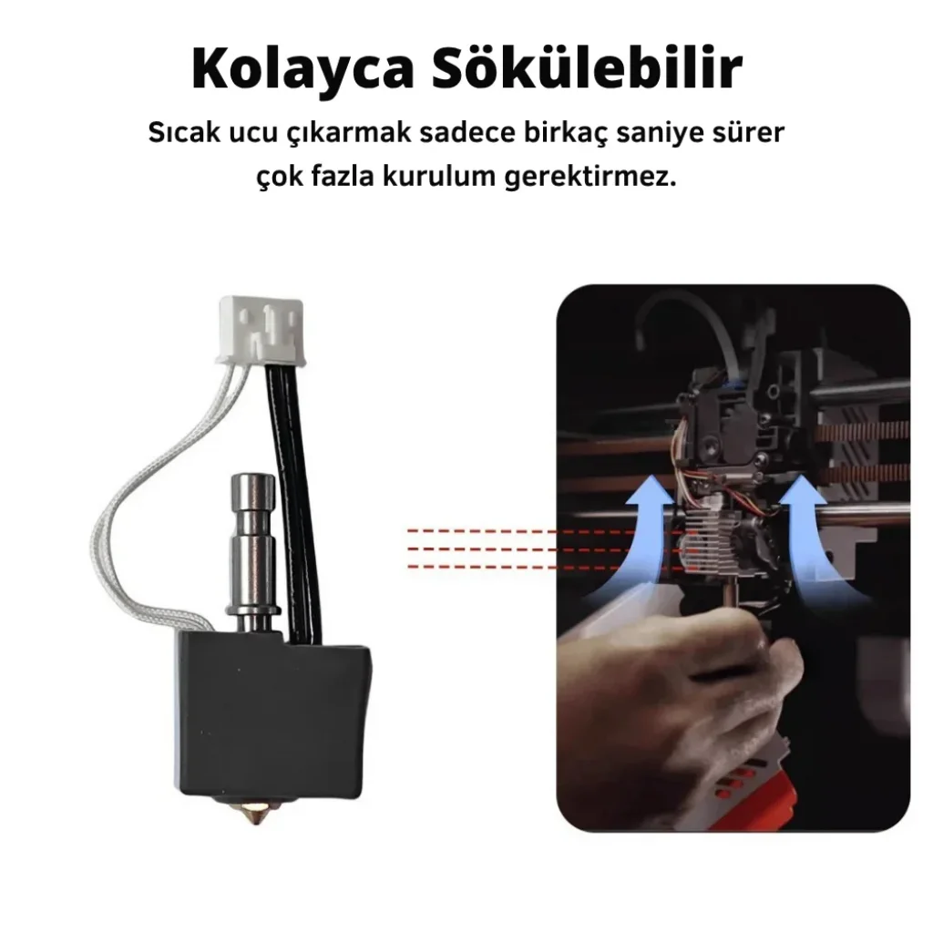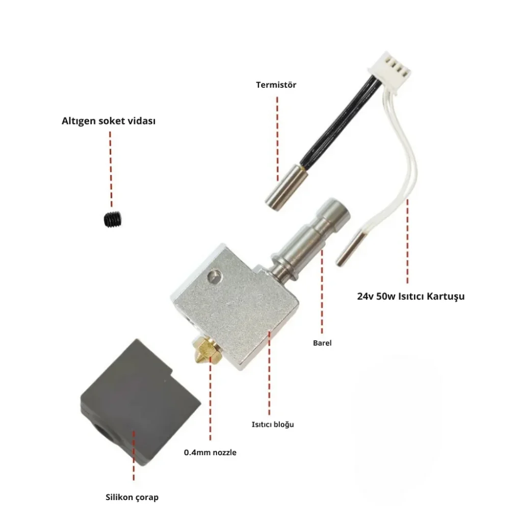 Önemli: Hotend kiti parçaları montaj kolaylığı için birleşik halde gönderilir. Ürünü yazıcınıza takmadan önce nozül, barel, blok, sensör ve ısıtıcı gibi bileşenlerin bağlantılarını kontrol edin ve iyice sıkıştırıldığından emin olun. Ürün klondur, orijinal ekipman üreticisi (OEM) parça değildir.