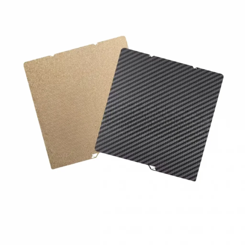 Anycubic Kobra S1 ve S1 Combo modelleriyle uyumlu bu çift yüzlü manyetik tabla, iki farklı kaplama seçeneği sunar. Karbon desenli PEI yüzeyi yüksek sıcaklık filamentlerinde (ABS, ASA, PC, PET-CF, PA-CF) mükemmel yapışma sağlarken, altın rengi PET yüzeyi PLA, PETG ve TPU gibi düşük–orta sıcaklık filamentlerinde güçlü tutunma ve kolay model çıkarma imkânı tanır. Yüzey dokuları, baskı altına estetik bir görünüm katar.