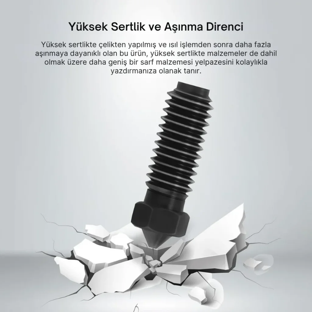 Anycubic Kobra S1 ve S1 Combo modellerine tam uyumlu bu 0.8 mm sertleştirilmiş çelik nozzle, ince ayrıntı gerektiren baskılarda yüksek hassasiyet ve tutarlı ekstrüzyon sağlar. Aşınmaya dayanıklı yapısıyla uzun servis ömrü sunar.
