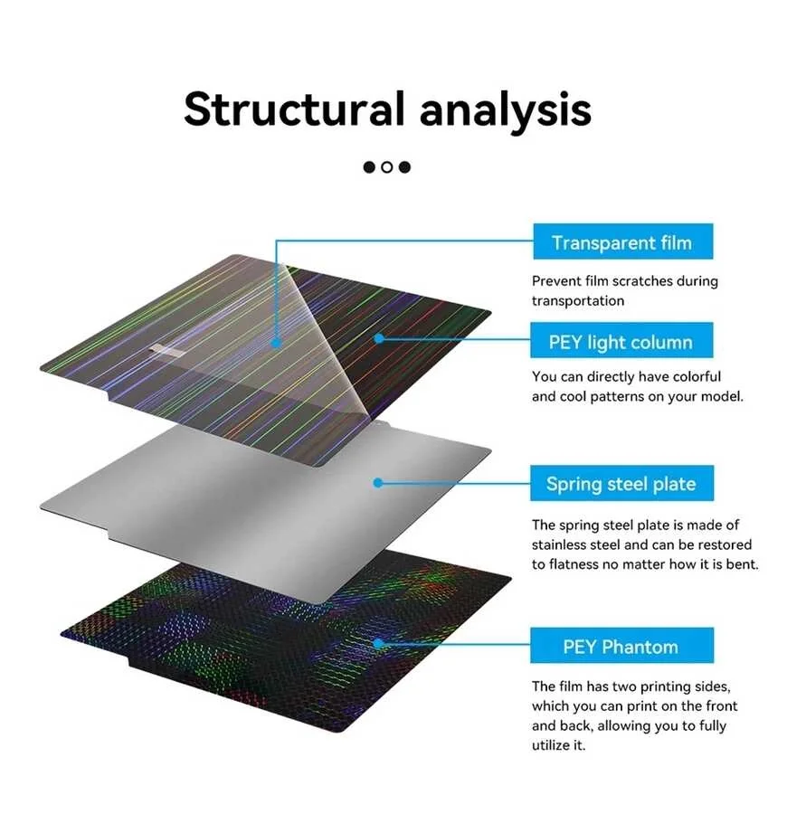 Bambu Lab serisi 3D yazıcılarla mükemmel uyumlu, iki tarafı farklı dokularda PEY kaplı olan yay çelik manyetik tabla ile baskılarınızda en iyi sonuçları elde edin. Hafif esnetilebilir yapısı sayesinde, baskılarınız bittikten sonra soğumasını bekleyerek kolayca çıkarabilirsiniz.
