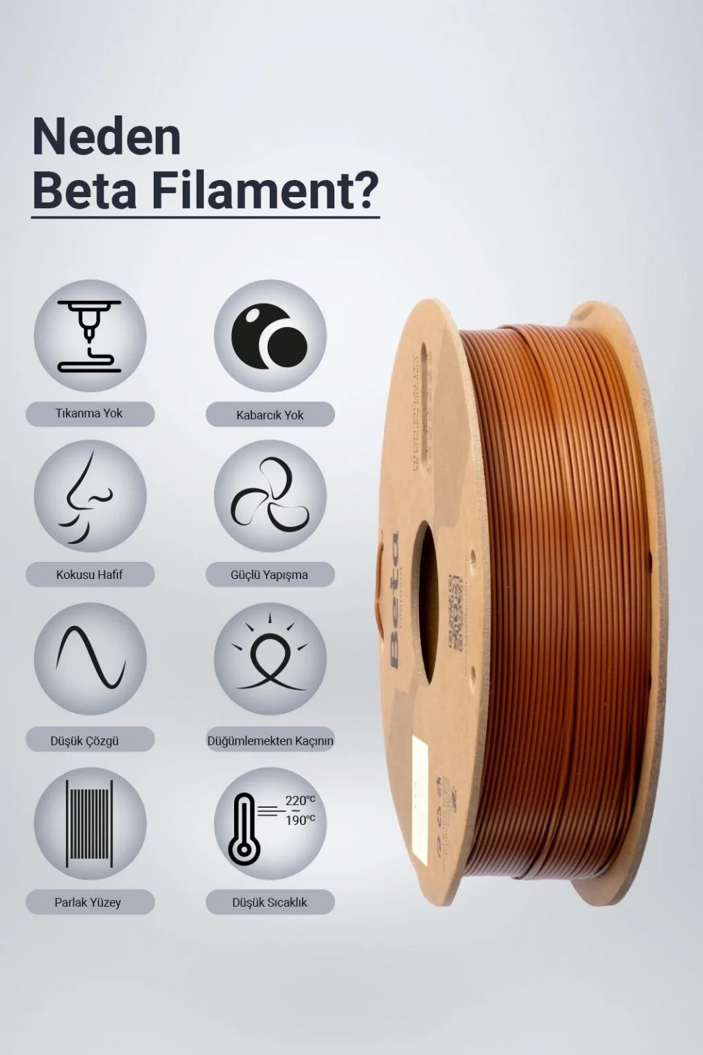 Beta PLA+, yüksek yoğunlukta pigmentler kullanılarak üretilmiştir. Bu da parlak, homojen ve doğru renk geçişlerine sahip modeller elde etmenizi sağlar. Kahverengi tonu, hem profesyonel hem sanatsal projelerde zarif bir görünüm sunar.