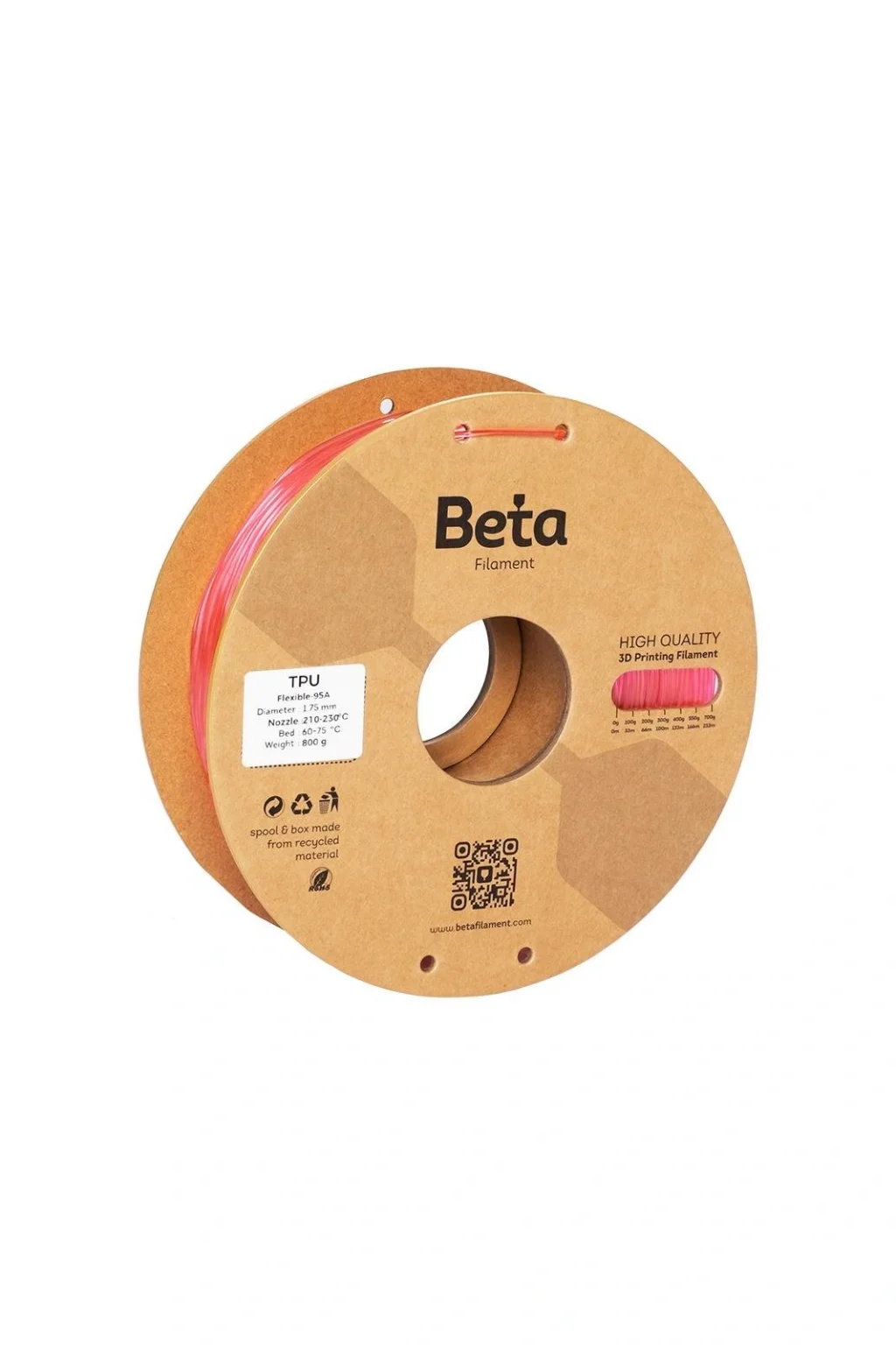Yeni nesil Beta TPU Shore 95A Filament, esneklik ve dayanıklılığı dengede sunar. Zorlu mühendislik projeleri ve fonksiyonel prototiplerde yüksek aşınma direnci, darbe dayanımı ve kaydırmaz yüzey performansıyla öne çıkar.