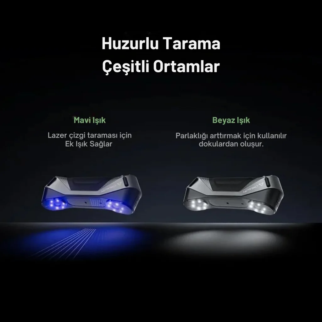 Creality CR-Scan Raptor, detay ve hassasiyetin kritik olduğu uygulamalar için tasarlanmış, üstün performanslı bir 3D tarayıcıdır. Mavi lazer ve kızılötesi ışık teknolojisinin yenilikçi birleşimini kullanarak, nesnelerin 3D şeklini son derece doğru ve ayrıntılı bir şekilde yeniden oluşturur. Bu sayede, daha keskin kenarlar ve zengin detaylar elde edilerek gerçeğe en yakın dijital modeller oluşturulur.