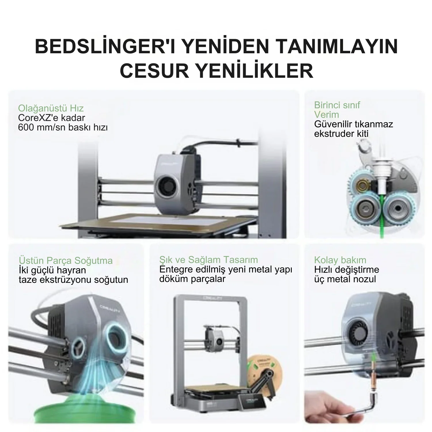 - Filament Uyumlu: PLA, PLA+, TPU, PETG, ABS, PLA-CF, PETG-CF, CR-carbon vb.