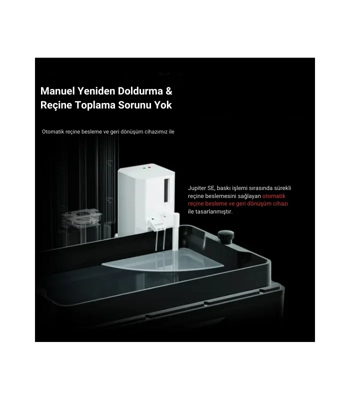 Elegoo Jupiter SE, büyük ölçekli ve yüksek detaylı reçine baskı projeleri için ideal bir seçenektir. Kullanım kolaylığı ve gelişmiş özellikleriyle hem profesyonel hem de hobi amaçlı kullanımlar için uygundur. Jupiter SE, özellikle büyük projelerde zaman ve malzeme tasarrufu sağlayan otomatik reçine besleme sistemi gibi yenilikçi özelliklerle donatılmıştır.