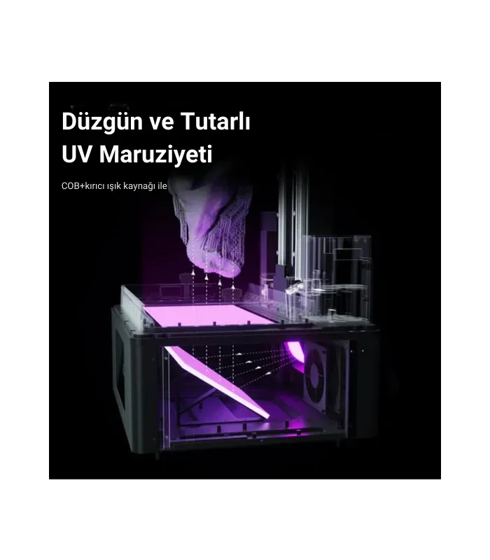 • Işık Kaynağı: COB+refraktif ışık kaynağı kullanılarak ışık yoğunluğunun baskı alanına eşit dağılması sağlanır, bu da keskin detaylar ve düzgün baskılar elde edilmesine yardımcı olur.