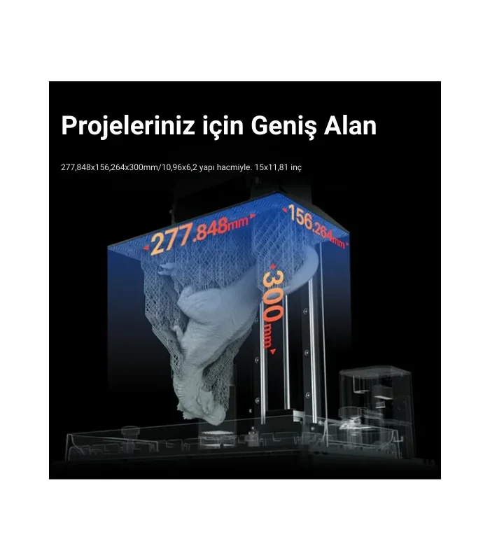 • Baskı Hacmi: 277.848 x 156.264 x 300 mm³ (10.94x6.15x11.81 inç),geniş projeler için yeterli hacmi sunar ve birden fazla parçanın tek seferde basılmasına olanak tanır.