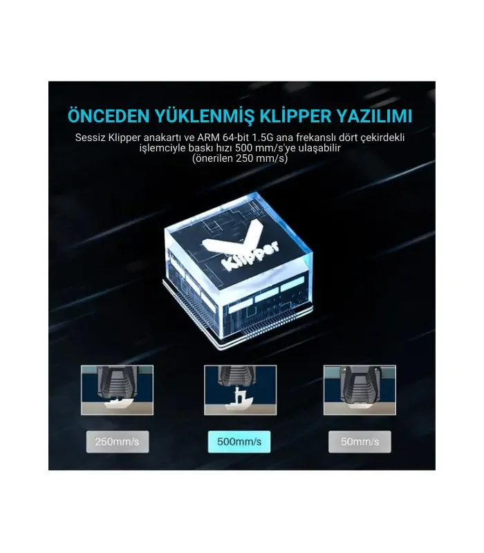 Elegoo Neptune 4, maksimum 500 mm/s'ye kadar baskı hızı ve 12000 mm/s²'ye kadar hızlanma kapasitesi ile piyasadaki en hızlı FDM 3D yazıcılar arasında yer alır. Standart kullanımda 250 mm/s hızında çalışabilir ve Klipper yazılımı sayesinde gelişmiş şekillendirme ve basınç ilerletme teknolojilerini destekler, böylece her baskıda mükemmel sonuçlar elde edilir.