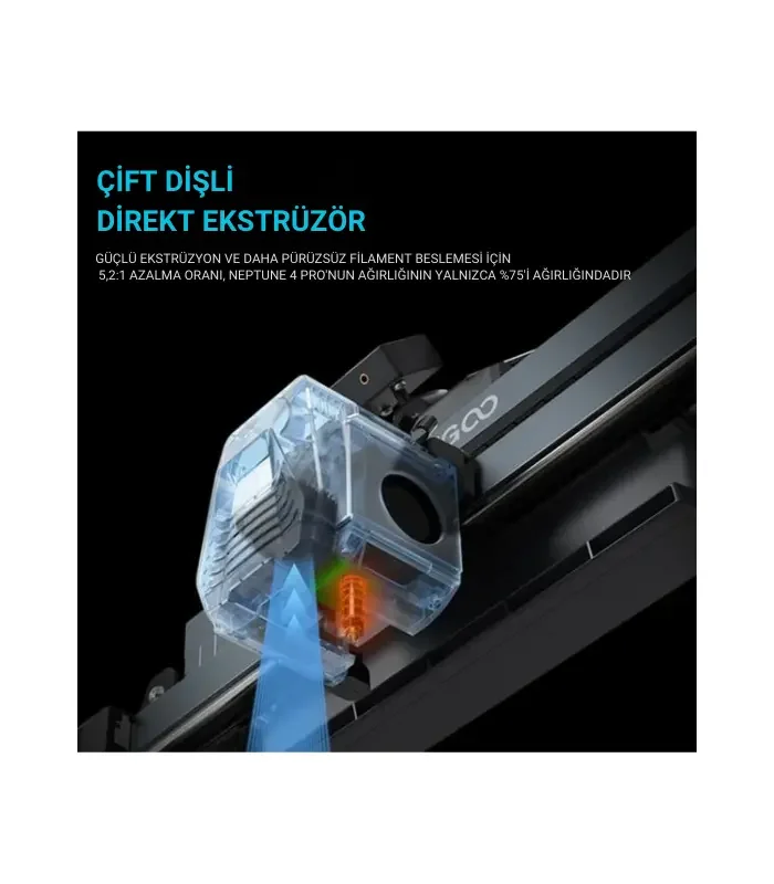 5.2:1 redüksiyon oranına sahip çift dişli doğrudan ekstruder, hızlı ve hassas ekstrüzyon sağlar. Bu özellik, ince detaylardan büyük doldurmalarına kadar her türlü baskıda tutarlı ve güvenilir bir performans anlamına gelir.