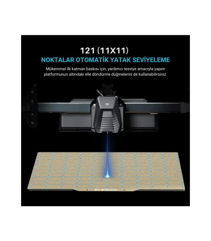 Elegoo Neptune 4, 121 noktalı otomatik yatak dengeleme sistemine sahiptir. Bu sistem, baskı yatağının her seferinde mükemmel şekilde seviyelenmesini sağlar ve her baskının başından sonuna kadar yüksek kalitede olmasını garantiler.