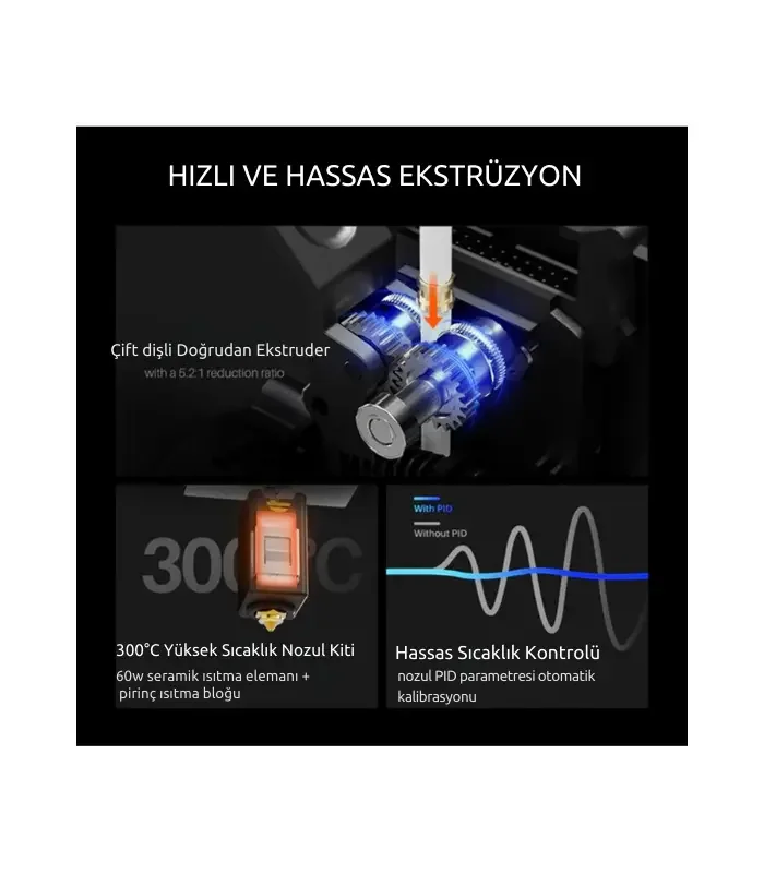 Nozul, ≤300 °C sıcaklığa ulaşarak PLA, PETG, ABS, TPU ve Naylon gibi geniş filament seçeneklerinin kullanımına izin verir.