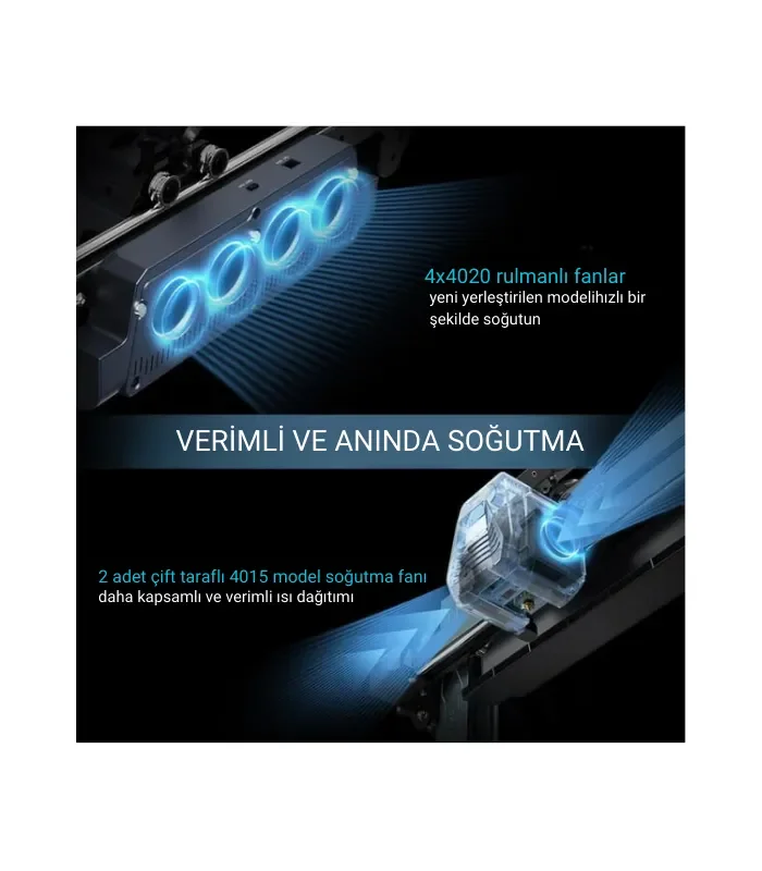 2×4015, 1×3010 ve 2×6025 rulmanlı fanlarla donatılmış soğutma sistemi, baskılarınızın hızlı sertleşmesini ve hassas formunu korumasını sağlar.