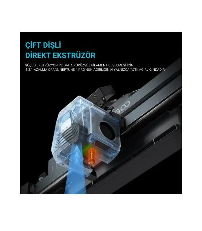 5.2:1 redüktör oranına sahip çift dişli ekstruder, ince detaylardan büyük dolgu parçalara kadar kararlı filament beslemesi sağlar.