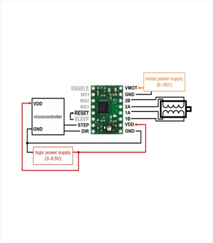 Devre, basit bir pin düzeni kullanarak kontrol edilir. Ayrıca, her bir adım motoru için ayrı ayrı mikro adım sayısı ve çıkış akımı kontrolü yapılabilir.