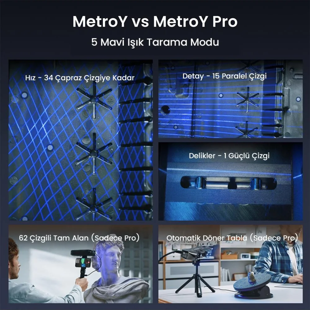 Revopoint Metro Y 3D Tarayıcı, mavi çizgi lazer teknolojisi ve yapılandırılmış ışık mimarisiyle yüksek doğruluk gerektiren mühendislik, tasarım ve endüstriyel uygulamalarda profesyonel düzeyde sonuçlar sunar. Parlak, koyu veya karmaşık yüzeylerde bile spreysiz tarama yapabilmesiyle öne çıkar. Kompakt gövdesi, yüksek kare hızına sahip tarama modları ve geniş platform desteği ile taşınabilir profesyonel bir çözüm sunar.